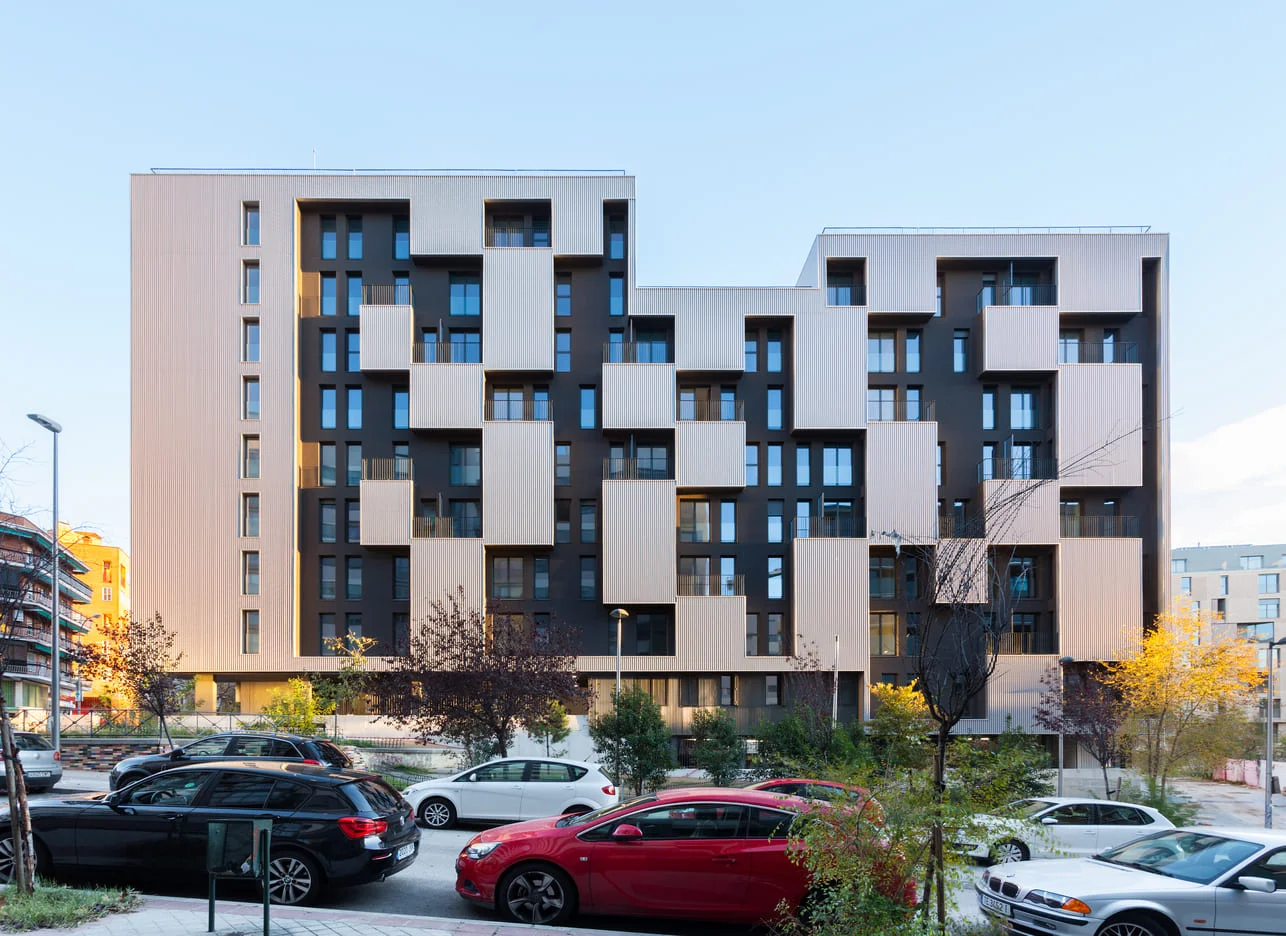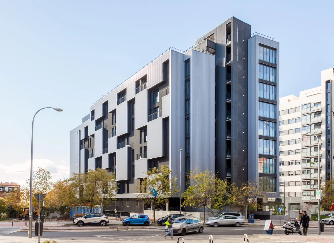 Edificio compuesto por un complejo de oficinas, centro comercial y hotel en el eje norte sur de la capital, en pleno centro de Madrid. La singularidad de la respuesta arquitectónica reside en un tratamiento dinámico de fachada, rompiendo su continuidad por medio de una abertura, creando diferentes volúmenes y comunicando la Castellana, arteria principal del centro de Madrid, con la manzana interior. El tratamiento que se le ha dado a la piel del edificio, por medio de una composición abstracta de la fachada, en la que la idea convencional de ventana desaparece, permite desdibujar la escala y presentar un objeto escultórico puro. Una actuación contemporánea para un edificio que se convierte en un hito de la ciudad.