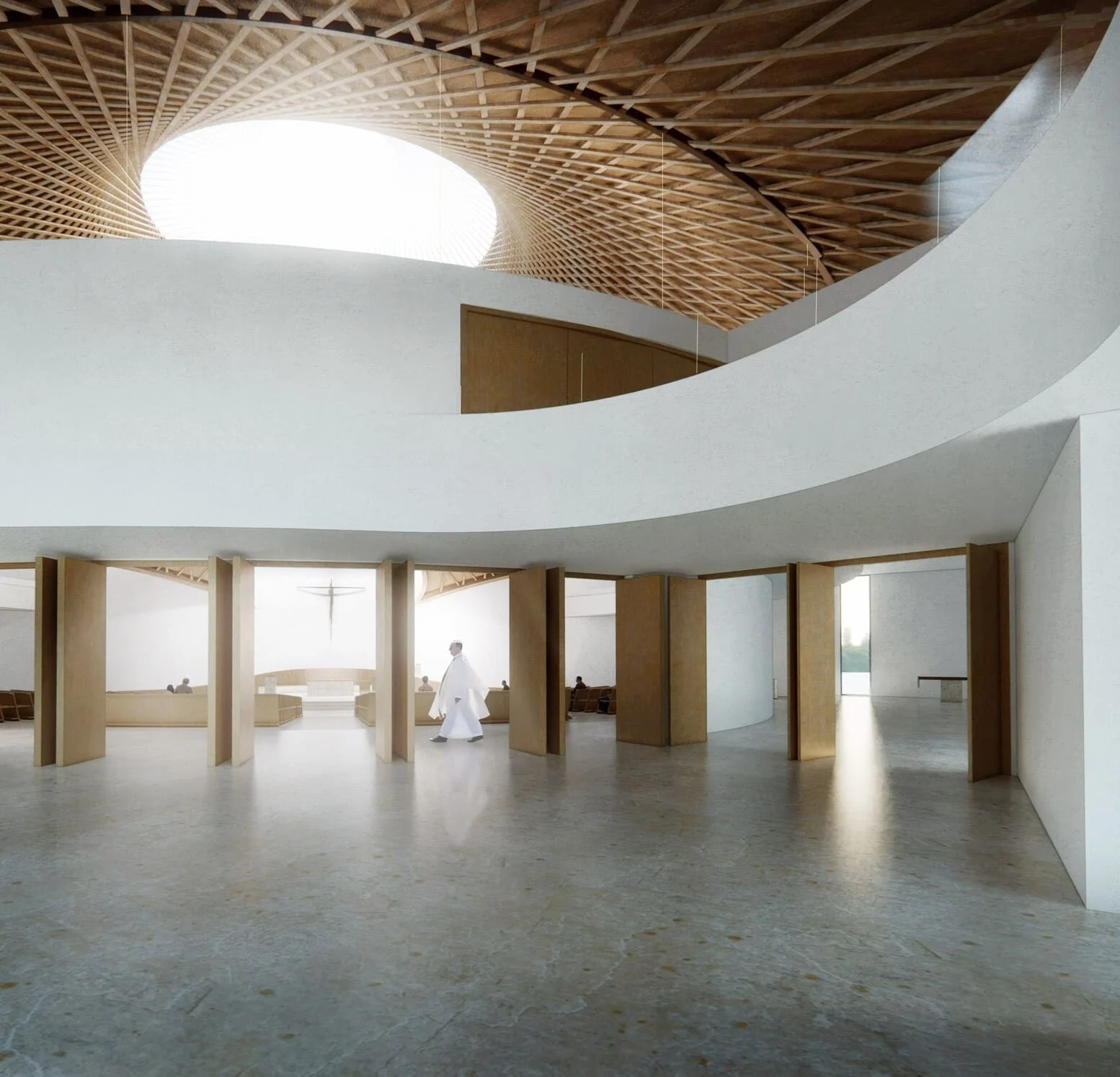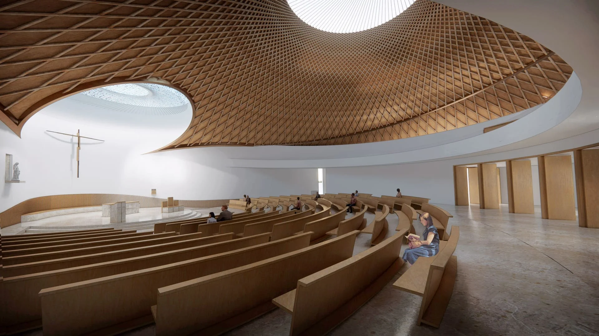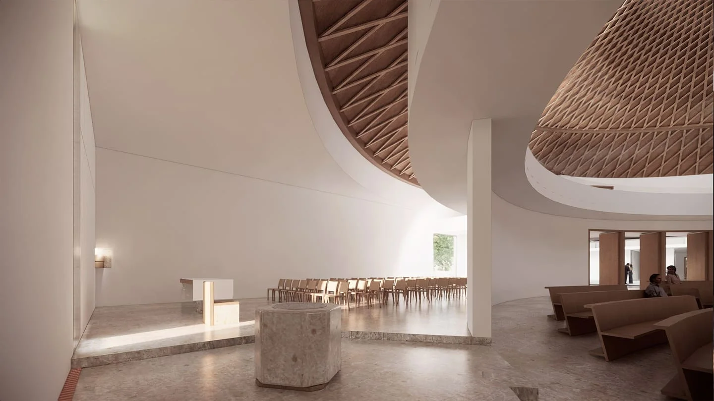 Está concebido con una idea de centralidad y direccionalidad que nos conduce siempre en una posición que mira el altar, es un espacio cilíndrico conectado sutilmente con otro cilindro menor generando una esquina/ábside/presbiterio que preside el espacio claramente, en el presbiterio elevado donde se sitúan: El altar, la sede, el ambón, la credencia, el sagrario y la cruz.